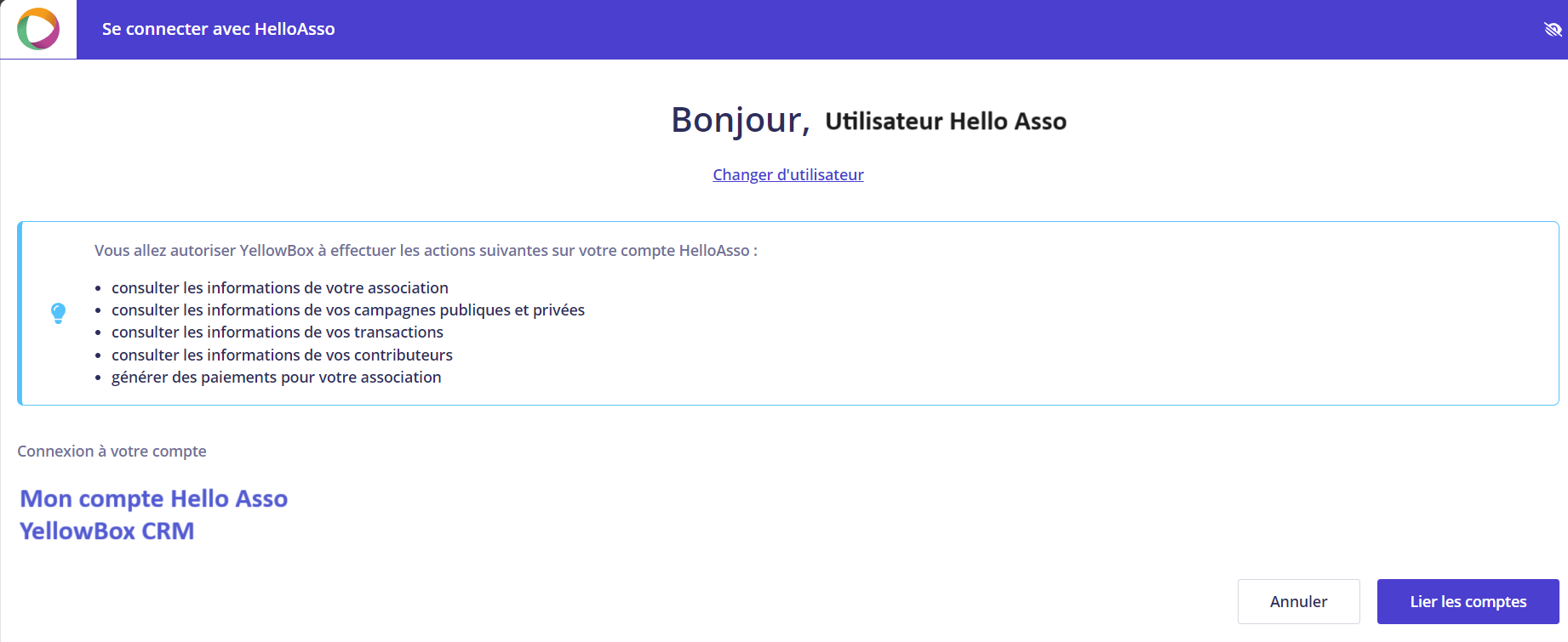 Un nouvel onglet s’ouvre et propose une page Hello Asso qui permet d’établir la connexion entre Hello Asso et YellowBox CRM :