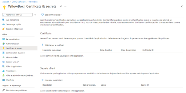 Cliquer sur le bouton [Certificats et secret] du menu de gauche