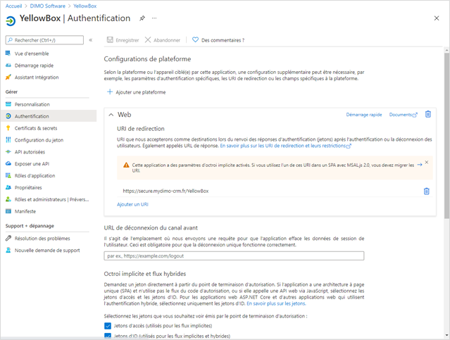 Cocher les cases ‘Jetons d’accès’ et Jetons d’ID’.L’URL de déconnexion est facultative.